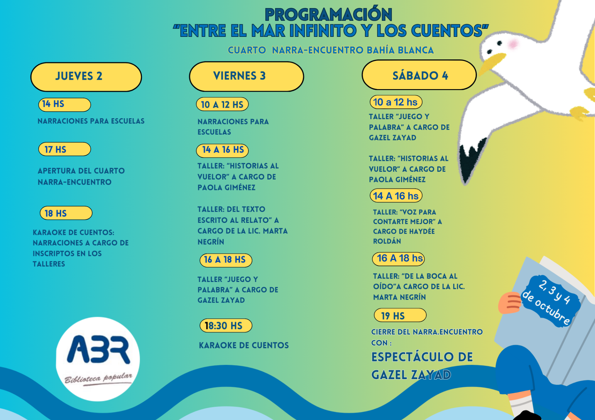Se llevarán a cabo los días 2,3 y 4 de octubre en diferentes espacios que ofrece la Biblioteca Rivadavia, Av. Colón 31 de la ciudad de Bahía Blanca.
